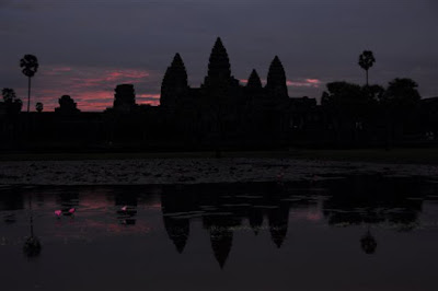 Seguimos as luzes e lá nos sentámos na borda de uma pântano à espera do acontecimento. A luz começou a aparecer e nós começámos a ficar sem respiração. Que momento mais imponente de ver o dia a nascer por trás de um monumento tão "monumental" e de uma grandiosidade tão impressionante. Este templo, Angkor Wat, um dos mais conhecidos, elevava-se à medida que a luz ia aclarando.